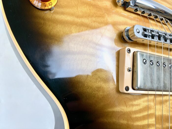 Cette Les Paul signature Slash est issue d’une série limitée à 1600 exemplaires. Les micros Alnico II signature ont été remplacés par d’excellents Seymour Duncan Peter Frampton du Custom Shop (699 € le set). Les plaques arrière ainsi que les condensateurs ont été changés. La table flammée est au top ! Celle-ci est en bon état. Vendue avec ses papiers, dans son étui d’origine.
